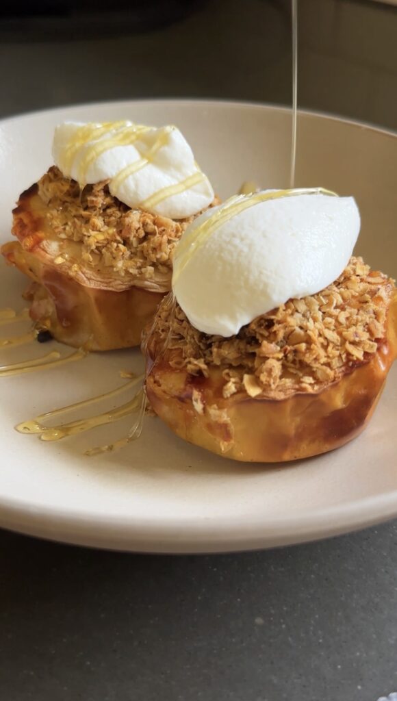 I always top my air fryer apple crisp with a spoonful of Greek yogurt for extra protein, a drizzle of honey, a sprinkle of flaky sea salt, and just a bit of cinnamon. (Honestly, after writing that, I’m realizing this would make a great fall breakfast, too).