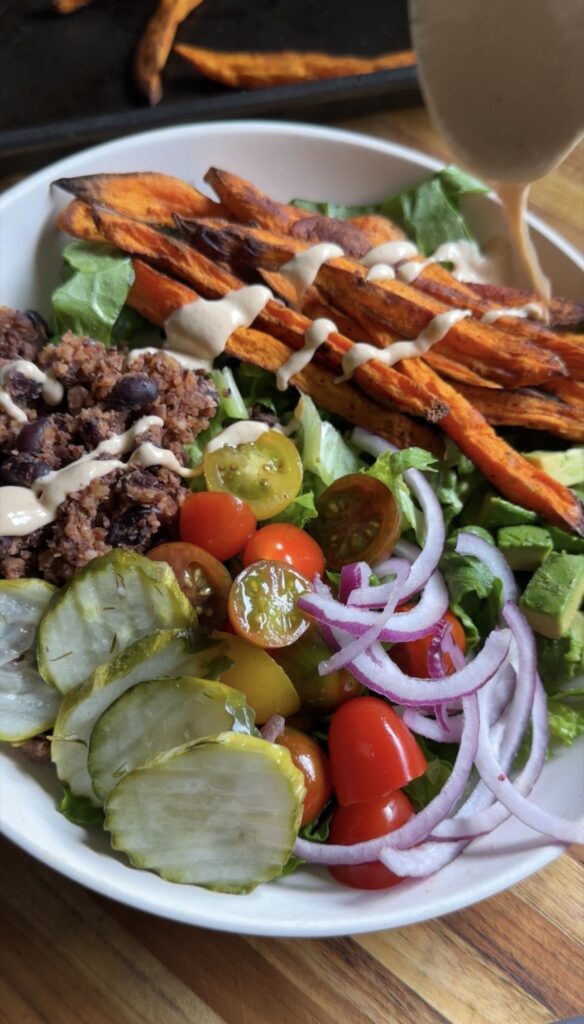 - Assemble bowls with romaine, black-bean walnut mixture, sweet potato fries, and desired toppings. Drizzle with dressing.
