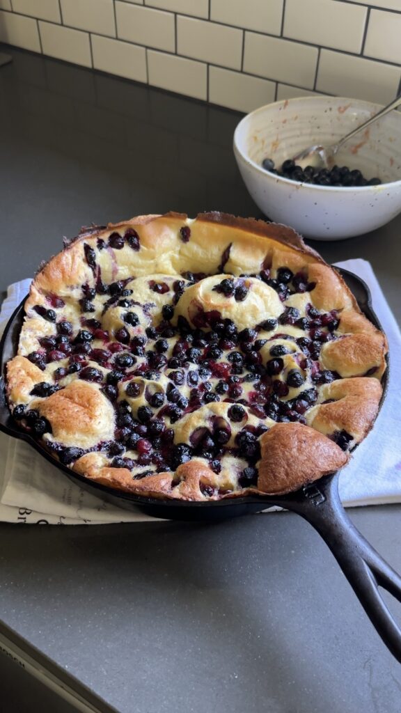 - When the oven is ready, carefully remove the hot skillet. Add the butter and quickly swirl to melt and coat the pan evenly. Add 1/2 cup of the blueberries and shake to evenly distribute. Slowly and carefully pour in the batter so that the berries remain evenly dispersed.