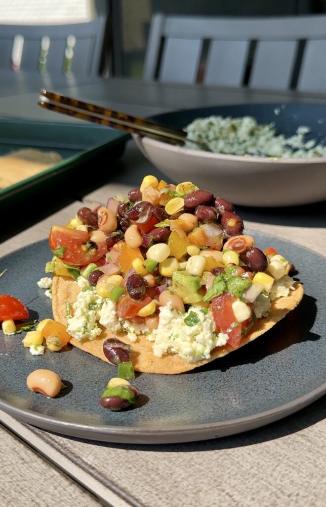 smashed feta tostadas with corn and bean salsa
