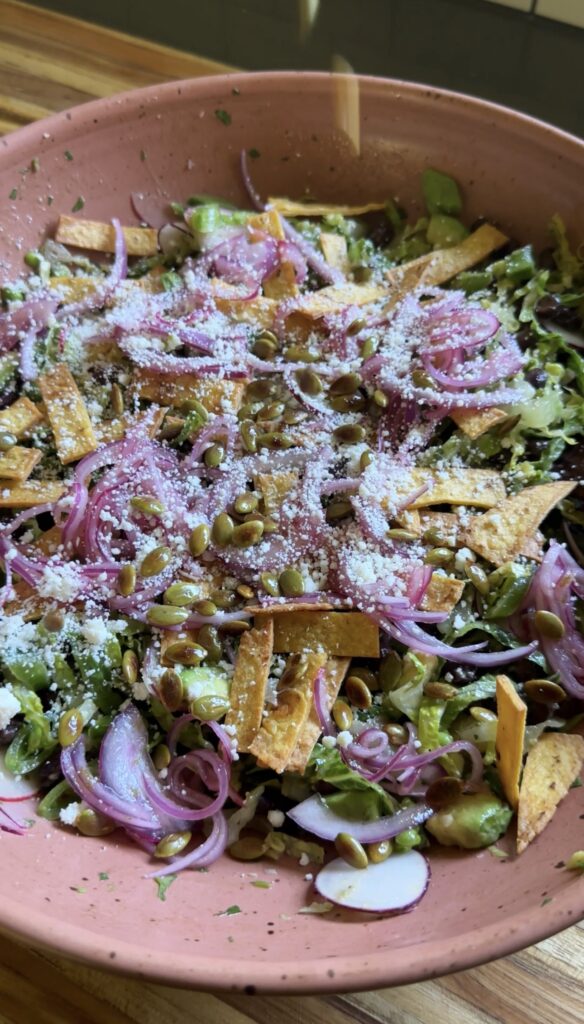 - Add radishes, snap peas, and avocado and toss to combine. Add romaine, tortilla strips, lime-pickled onions, and any additional toppings (I used cotija and toasted pepitas) and toss again. Season with salt to taste and divide into bowls.