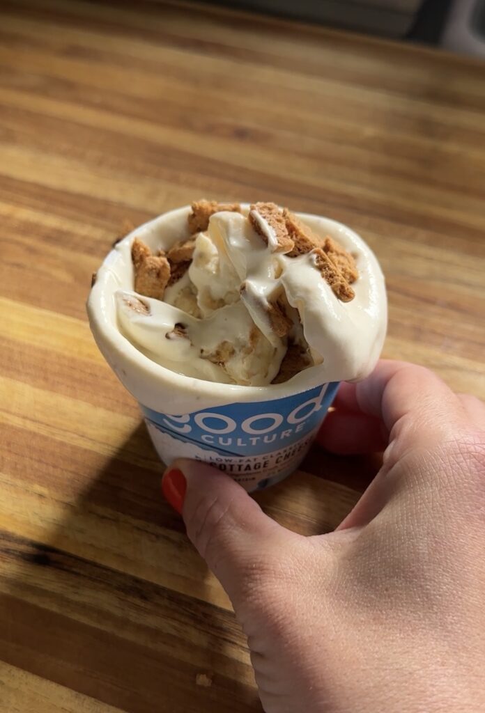 Add one-third of the pudding mixture to the now-empty cottage cheese cup (or small bowl). Crumble in a cookie or two (exactly how many you need will depend on what size your cookies are. I use two cinnamon thins per layer). Add half of the remaining banana slices.